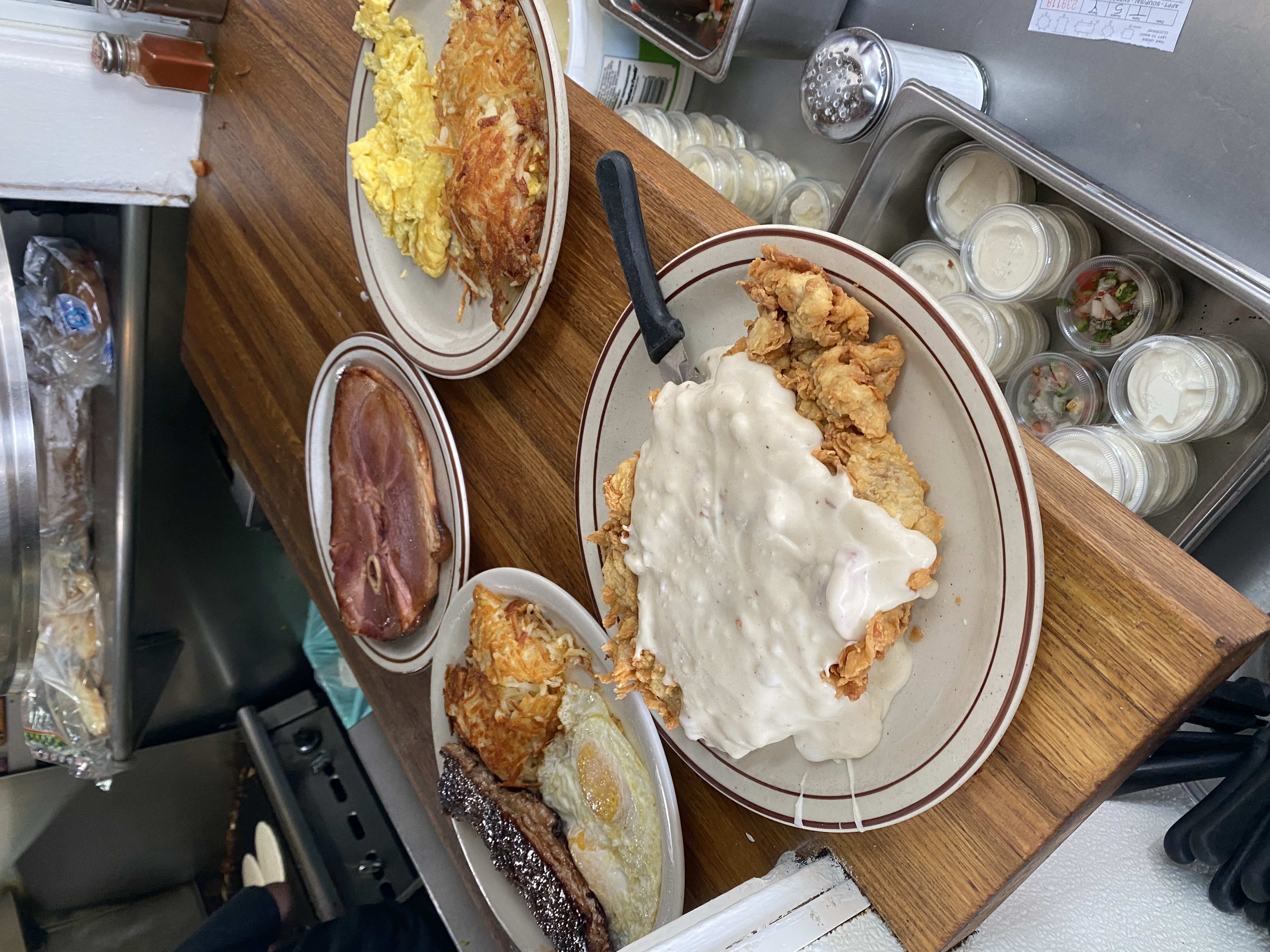 “So BIG It’s Served on 3 plates” Served with 2 Eggs, Potatoes and Toast or Biscuit and Gravy.